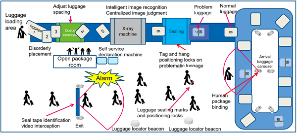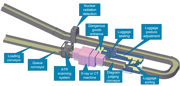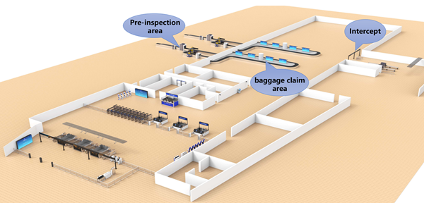 Utilizando tecnologías como la inteligencia artificial, el Internet de las cosas y el análisis de Big data, se completa la inspección del 100% del equipaje facturado de manera rápida y precisa. El sistema incluye un sistema de transmisión, un subsistema de revisión centralizada de inspección previa de equipaje, un subsistema de adquisición de apariencia de equipaje, un sistema de identificación de caja, un sistema de clasificación automática de equipaje controlado, un dispositivo inteligente de sellado de equipaje, un canal de Inspección inteligente, un terminal móvil de Inspección inteligente, etc., para ayudar a la aduana del aeropuerto a realizar la inspección previa, el control, la identificación sin interferencia perceptiva y la alarma de interceptación del equipaje facturado de pasajeros. Cumplir con la supervisión aduanera de la inspección y supervisión del 100% del equipaje de los pasajeros despachados, y realizar la revisión centralizada remota del mapa de inspección aduanera del aeropuerto, el control de pasajeros de equipaje, la consulta de información sobre equipaje sospechoso y pasajeros, la alarma de interceptación, la gestión empresarial y otros servicios.
